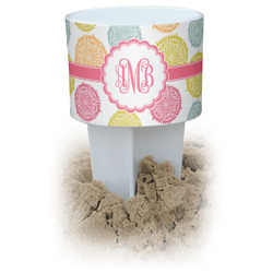 This cup holder has a large stake at its bottom that anchors it to the sand or ground below, while the cup holder rests above the stake. The entire drink holder is made of durable plastic and displays your customization around the cup holder portion. We sell these personalized beach spikers in two different colors: black and white.