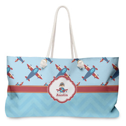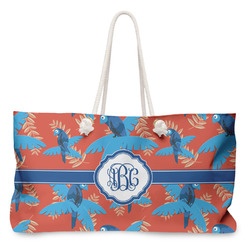 Our oversized weekender tote with rope handles is perfect for your weekend at the beach or on the town. This large tote are 24" W X 13" H, with a 5" gusset and a 27" thick rope handles with a knot that is put through a grommeted brass hole.