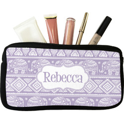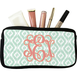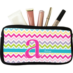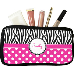 Our personalized makeup bags are available in many different designs, patterns and colors - so you are sure to find one that will love. They are made of neoprene (same material as wet-suits) and thus are water resistant, so spillages in your makeup bag will not end up all over you purse. They are customized on one side and are black on the other side and the zipper is black as well.