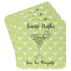 These coasters are perfectly sized for just about any drink being a 4"in square. The paper construction is a thick heavyweight 80 point pulpboard perfect for absorbing the condensation on the outside of your glass.