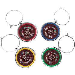 Your wine glass markers are comprised of a circular zinc plate with a 1.25 inch diameter. The zinc plate hangs from a zinc loop, which can be easily secured and removed from the stem of a wine glass. Your customized design is printed onto a 1 inch diameter insert, and then placed into the wine glass charm itself. Though sold in a set of four, you can personalize each charm individually and change the colors of the ring around your design, depending on your needs.
