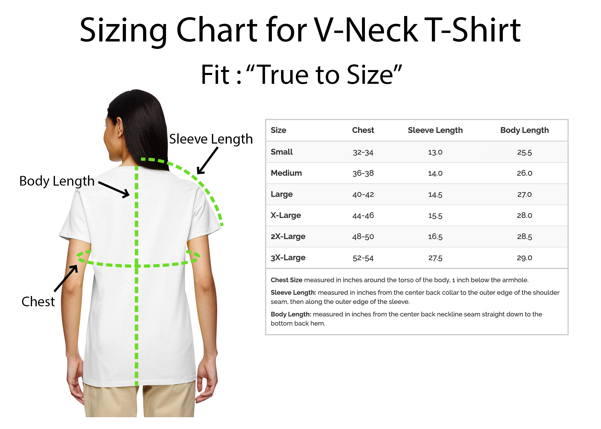 Our feminine cut V-neck t-shirts fit true to size. The V-neck t-shirt does have a tapered shape to achieve the missy contoured silhouette so if you prefer a looser fit, we recommend sizing up. Our sizing chart for this garment is below: