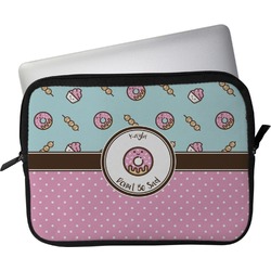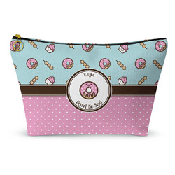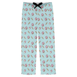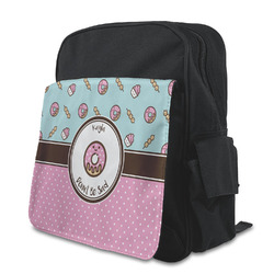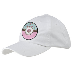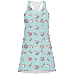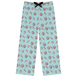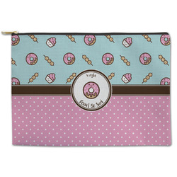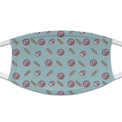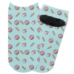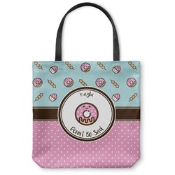 This design is a beautiful light blue/teal and light pink. The top half of the design has a fun pattern with a blue/teal background and pink donuts and other treats. The bottom half is a bright pink polka dot pattern. Each background is divided by a dark brown ribbon. On top of these is a round label with an adorable donut and your personalization right in the middle.