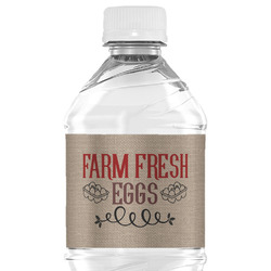 This design uses the quote "farm fresh eggs" with two crates of eggs pictured on either side and a beautiful scrolling design below. The quote has a bright and dark red, both which stand out beautifully against the burlap textured background. This quote and a chicken graphic are used throughout the design.
