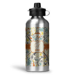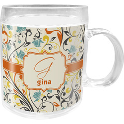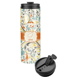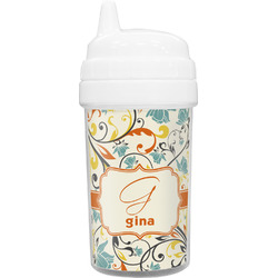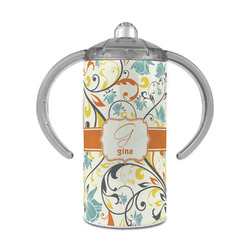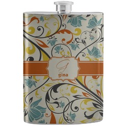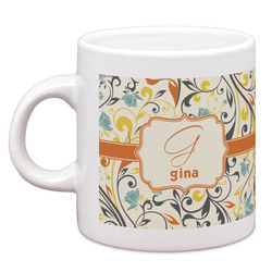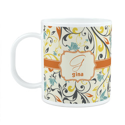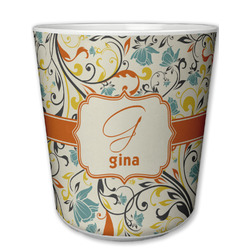 The design combines green, blue, and yellow flowers with swirls of black. The floral pattern is set on a background of white to showcase the print. The design has a classic ribbon in orange trimmed in white. The decorative white label is trimmed in orange. Add an initial and a name for that personal touch to pull the entire design together.