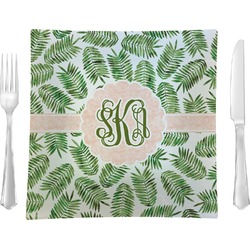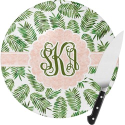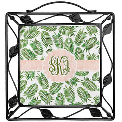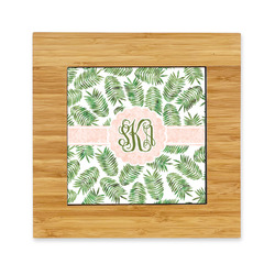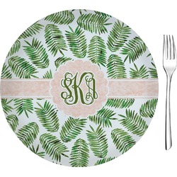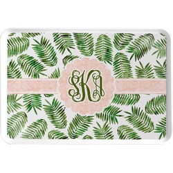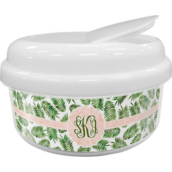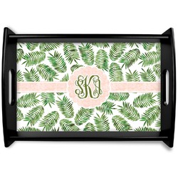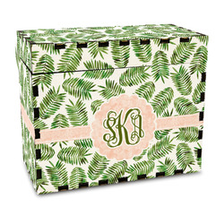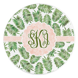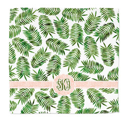 The background of the main design is filled with thin tropical leaves scattered about. The leaves are filled with a dark green watercolor texture. The ribbon and scalloped frame are filled with a light peach watercolor texture. The monogram in the middle gives an extra feminine touch to this design.