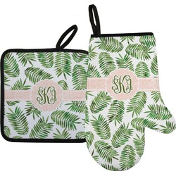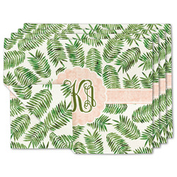The coordinating design has the same leafy background and peach ribbon. In place of the framed monogram, there is a large initial and name filled with a dark green watercolor texture.