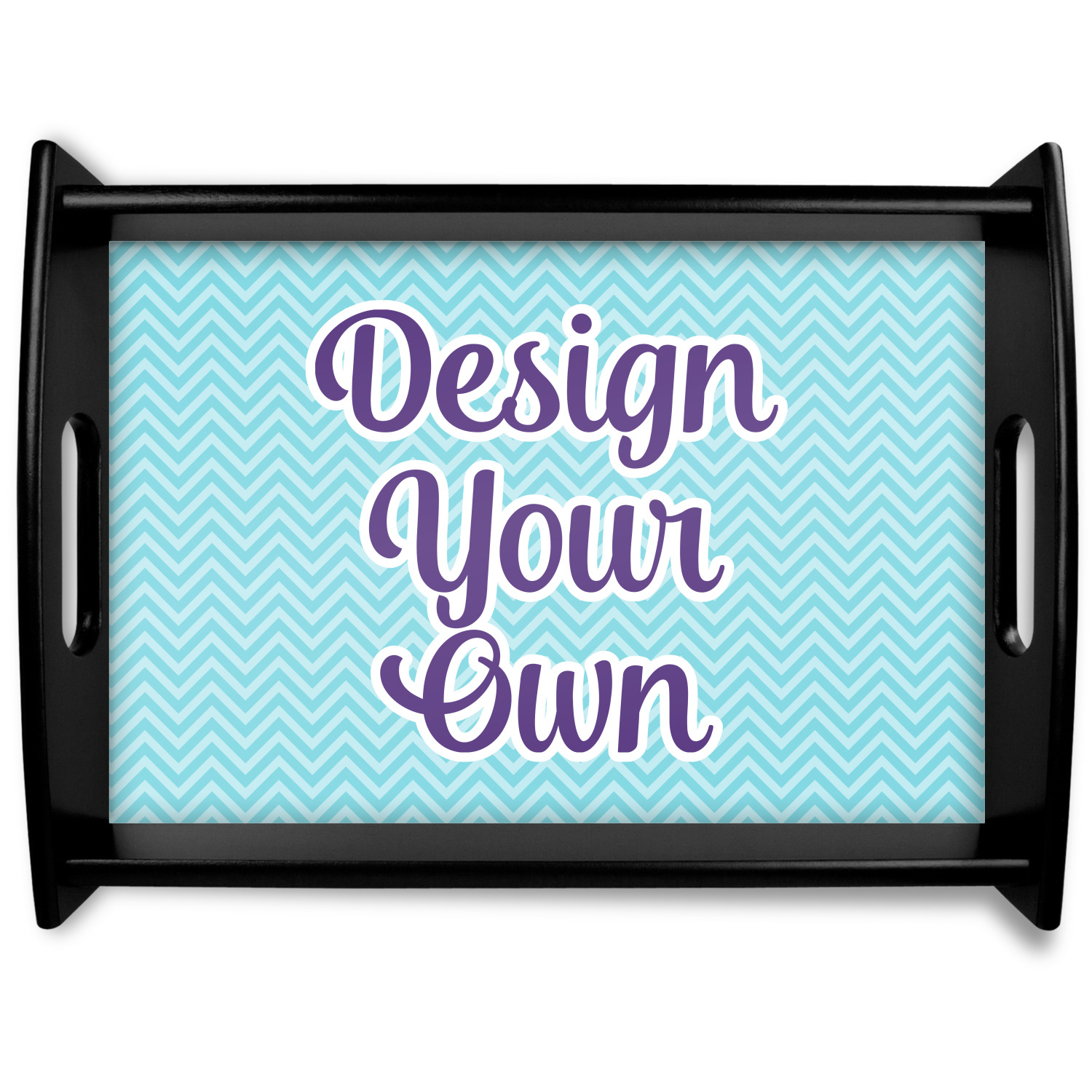 This serving tray with handles features square edges and two rounded sides, creating a very modern look. Each side is fabricated from a beautifully cut, natural wood. The bottom of the interior of the tray displays your customized design in bright, vibrant color. The tray is sold in both a black color and a natural wood look. Each variation of the wood serving tray has two sizes: Small, which is 14" x 10" x 2.25", and Large, which is 19.5" x 13.5" x 2.75".