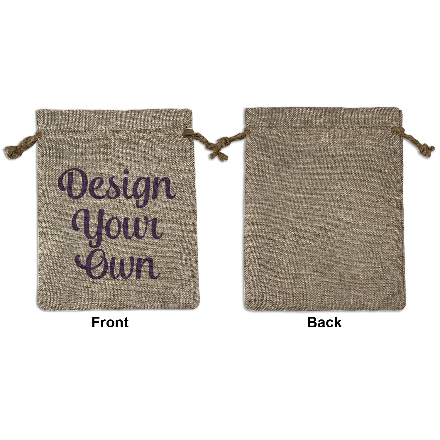 We sell our Burlap Gift Bags in 3 variant sized bags. Made with burlap polyester, each personalized bag can be secured with a twine drawstring pull. Your custom design is available to print on one side or both sides - completely up to you! The sizes of the bags measure approximately 4.5" x 6.5" for the smallest size, 6.5" x 8.0" for the medium size, and 6.5" x 13.5" for the large-sized bag.