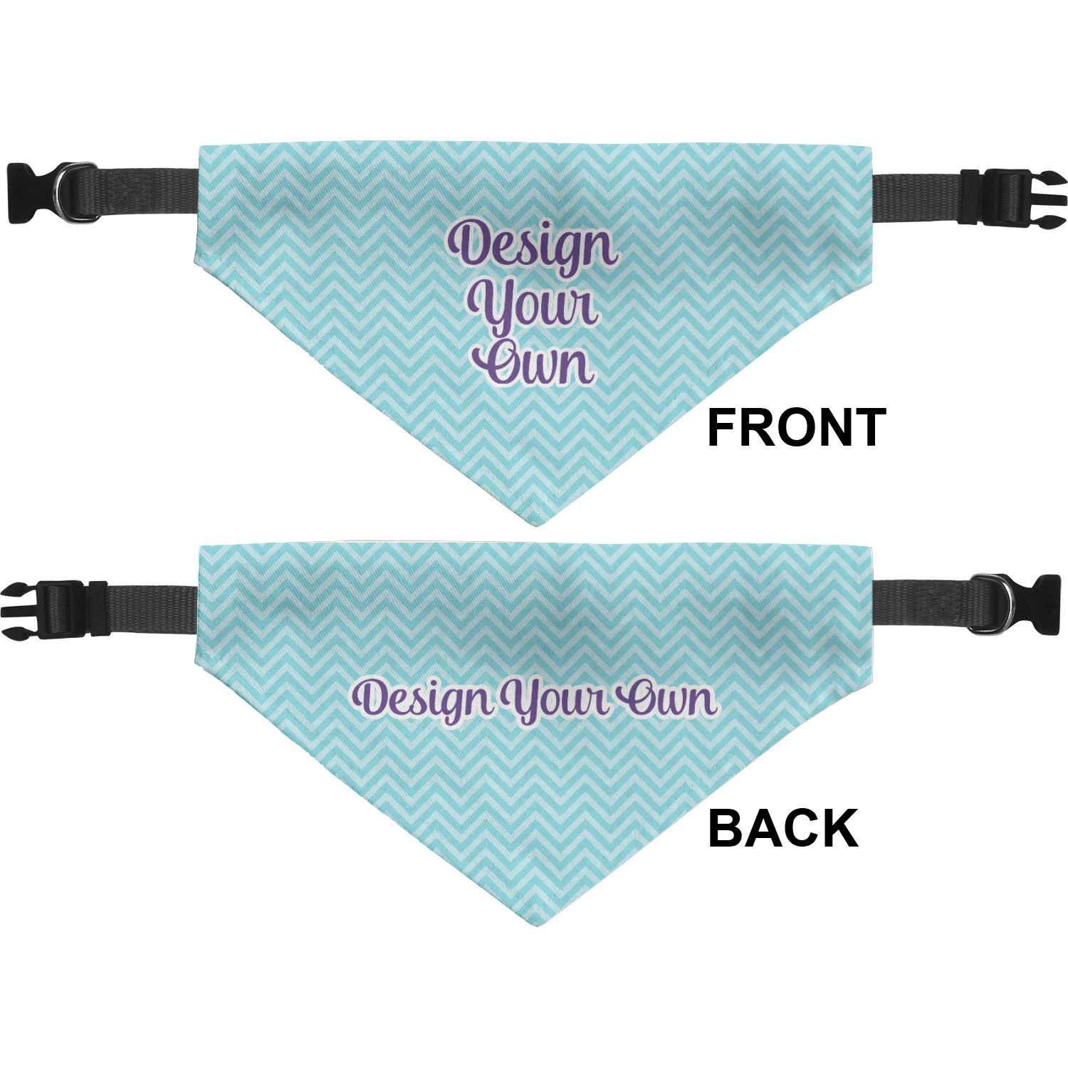 We print the front and back of these dog bandanas with your customized design. The bandana itself is made from a durable polyester, sewn together with a gap large enough to accommodate any collar. Regardless, the bandana includes a plain black, canvas collar with plastic snaps, that can easily be removed if desired. These dog bandana collars are available in four sizes: small, medium, large, and extra large. Please see our sizing chart for more information regarding the dimensions of each size.