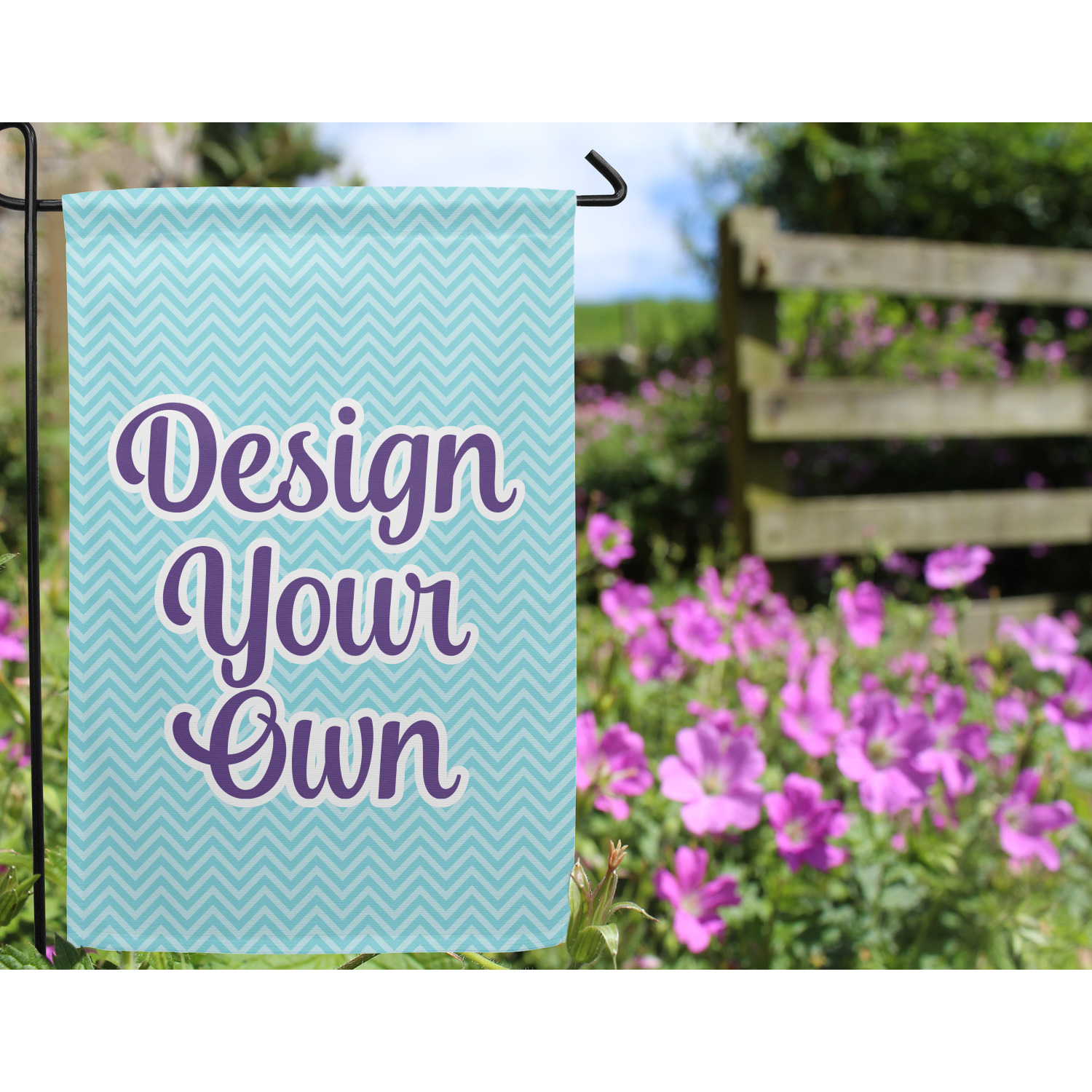 These custom garden flags are made of a durable, double-ply, polyester weave, allowing them to withstand the elements year round. The small flags measure at approximately 12 by 18 inches. The large flags measure out to 28 by 37 inches. You can order these decorative flags with your customization printed on the front only, or the front and back.