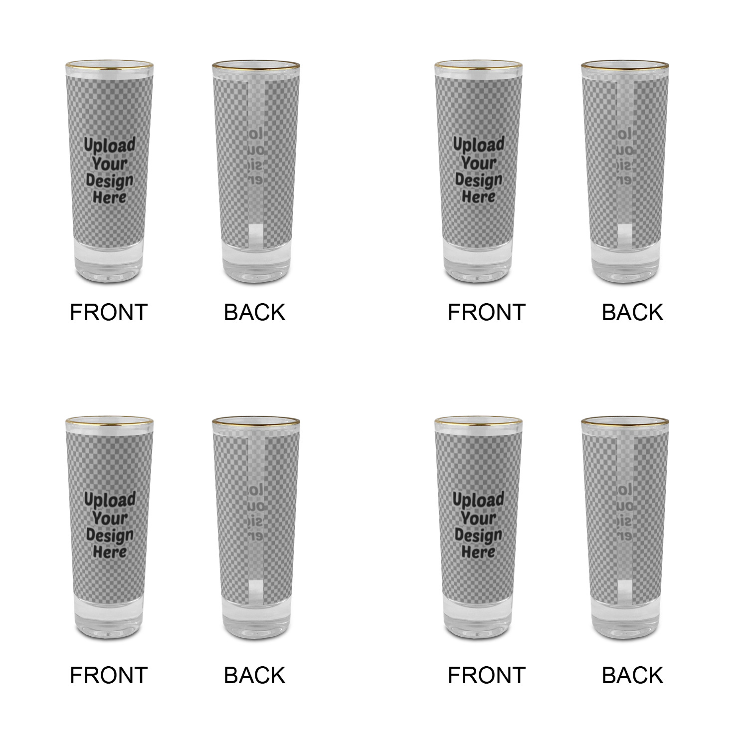These glass shooter glasses are printed in full color with the design of your choice. These are a tall shooter 2 oz size and stand 4" tall. The print is a full wrap design to boldly display your personalization.
