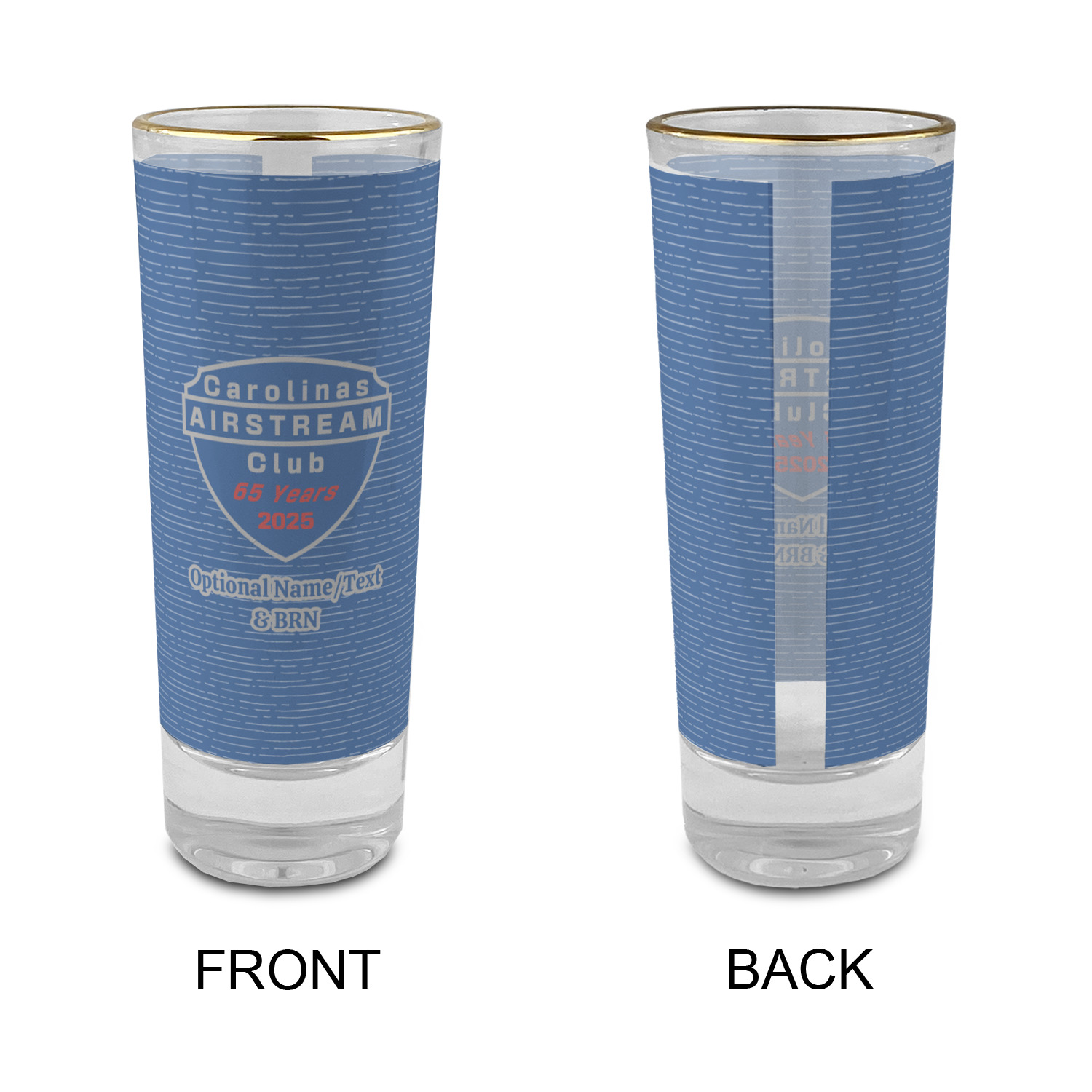 These glass shooter glasses are printed in full color with the design of your choice. These are a tall shooter 2 oz size and stand 4" tall. The print is a full wrap design to boldly display your personalization.