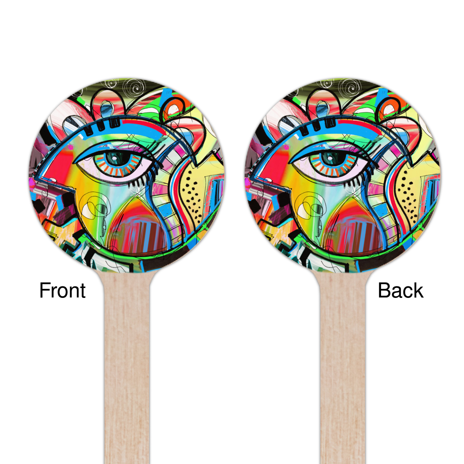 This design features a large abstracted eye in the center, surrounded by extremely vibrant, surrealistic shapes.