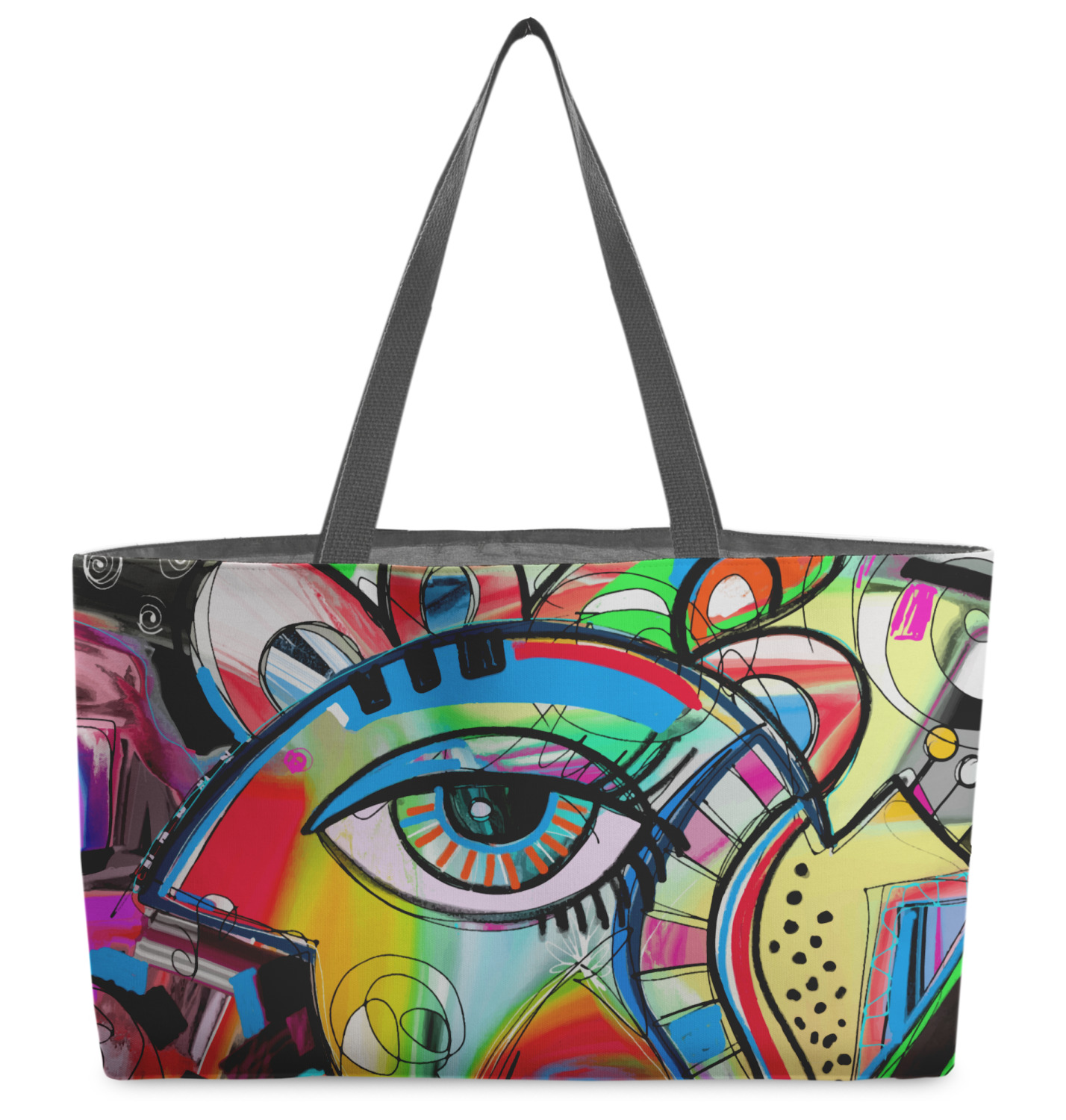 This design features a large abstracted eye in the center, surrounded by extremely vibrant, surrealistic shapes.