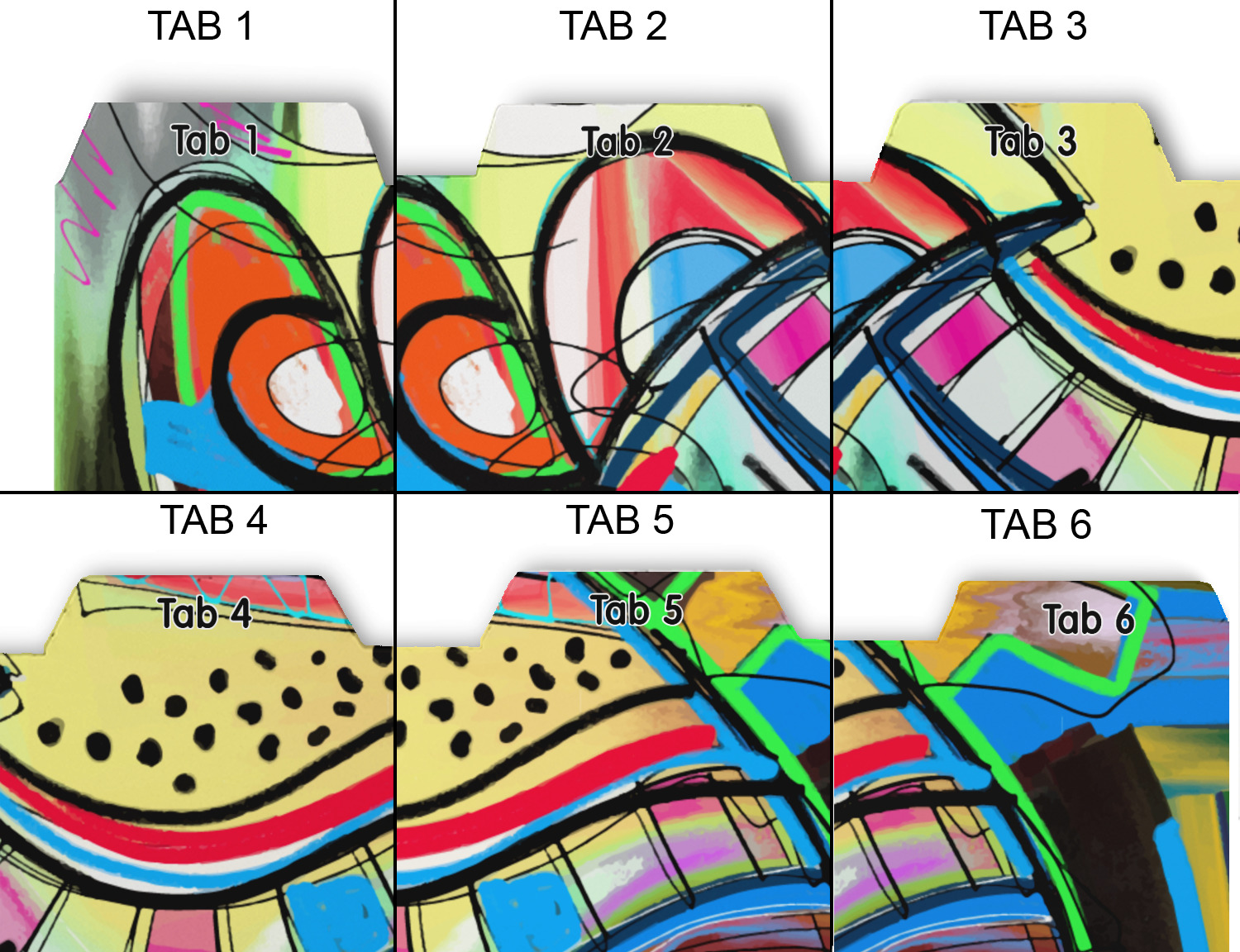 Whether you use binders at school or at work, we have designs to suit all of them. Available in 5 or 6 tab sets, you are sure to find a set to suit your needs. The back of each one is white and can be used to take notes, write vital information on, etc.