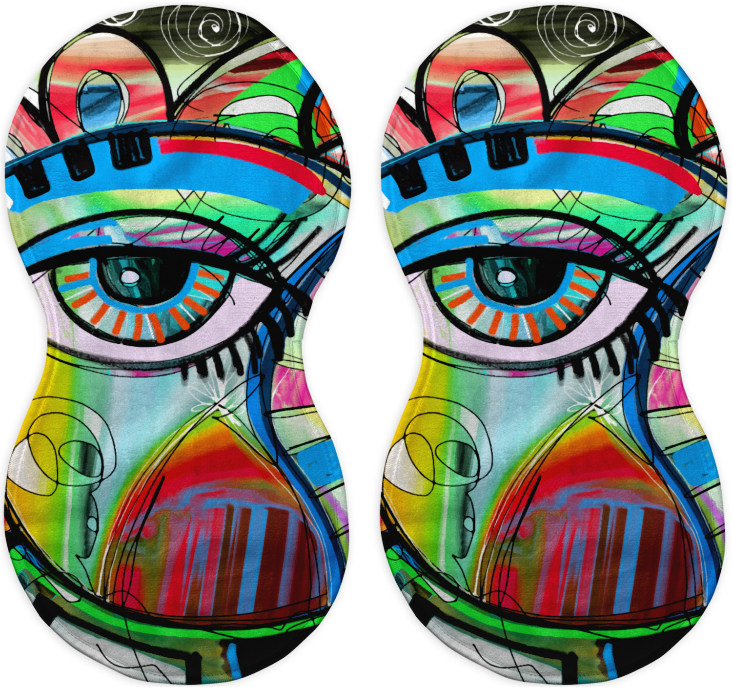 This design features a large abstracted eye in the center, surrounded by extremely vibrant, surrealistic shapes.