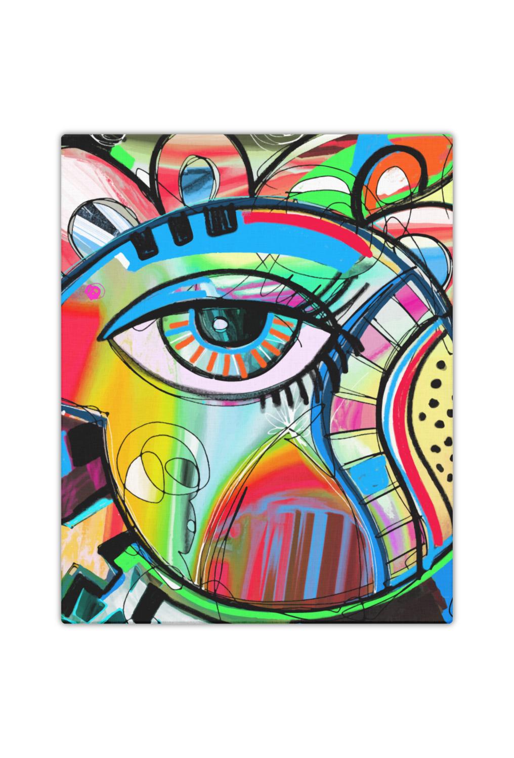 This design features a large abstracted eye in the center, surrounded by extremely vibrant, surrealistic shapes.