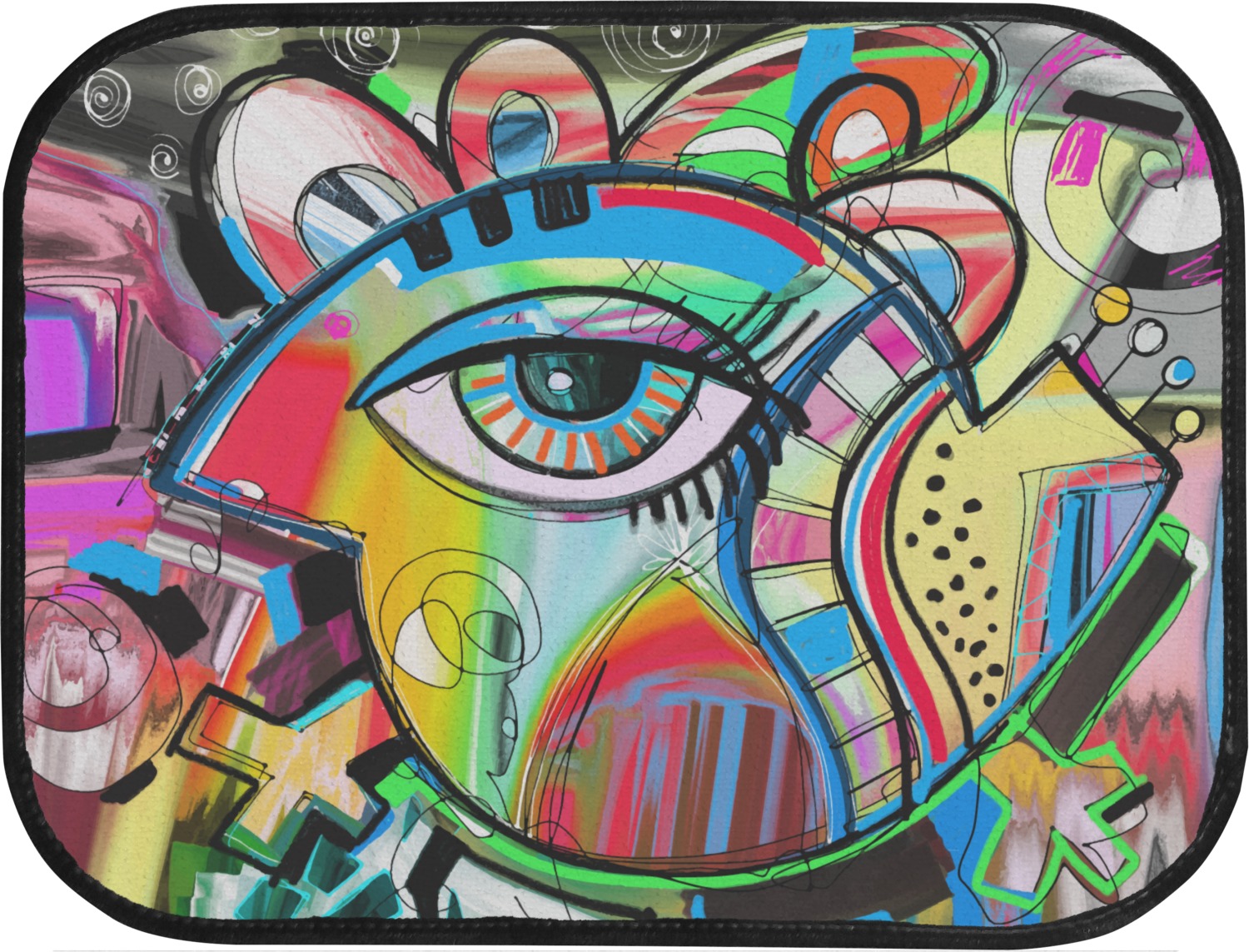 This design features a large abstracted eye in the center, surrounded by extremely vibrant, surrealistic shapes.
