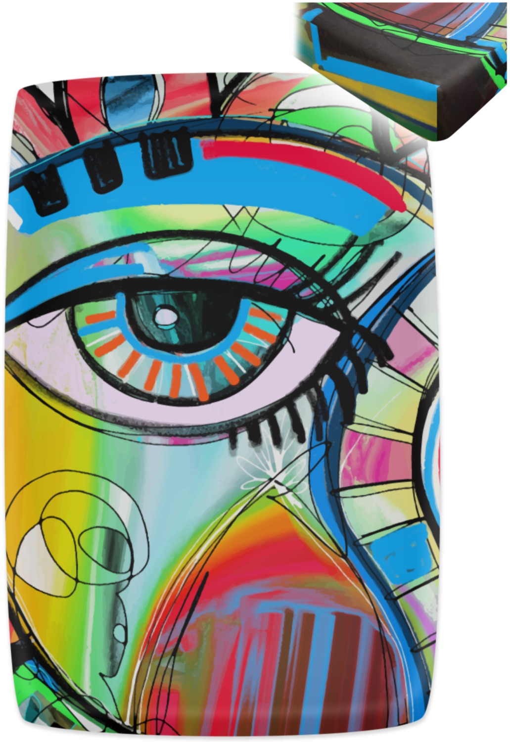 This design features a large abstracted eye in the center, surrounded by extremely vibrant, surrealistic shapes.