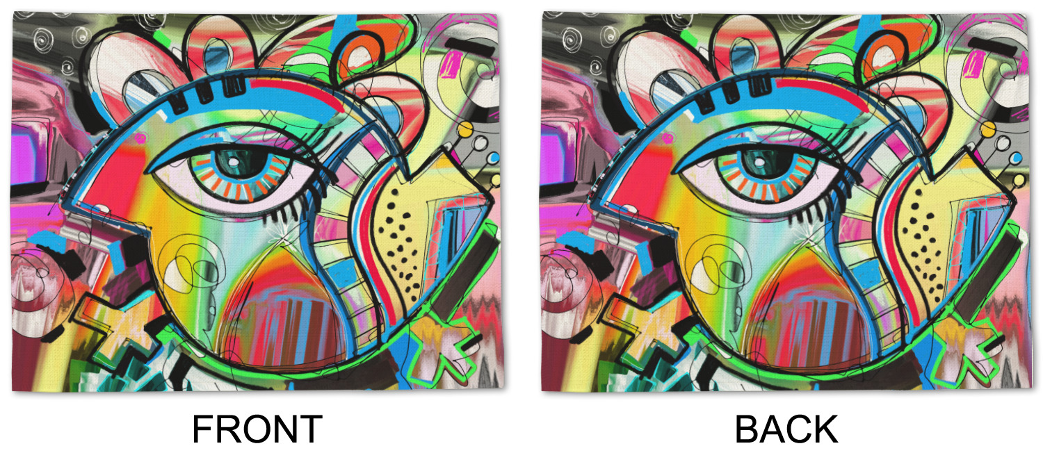 This design features a large abstracted eye in the center, surrounded by extremely vibrant, surrealistic shapes.