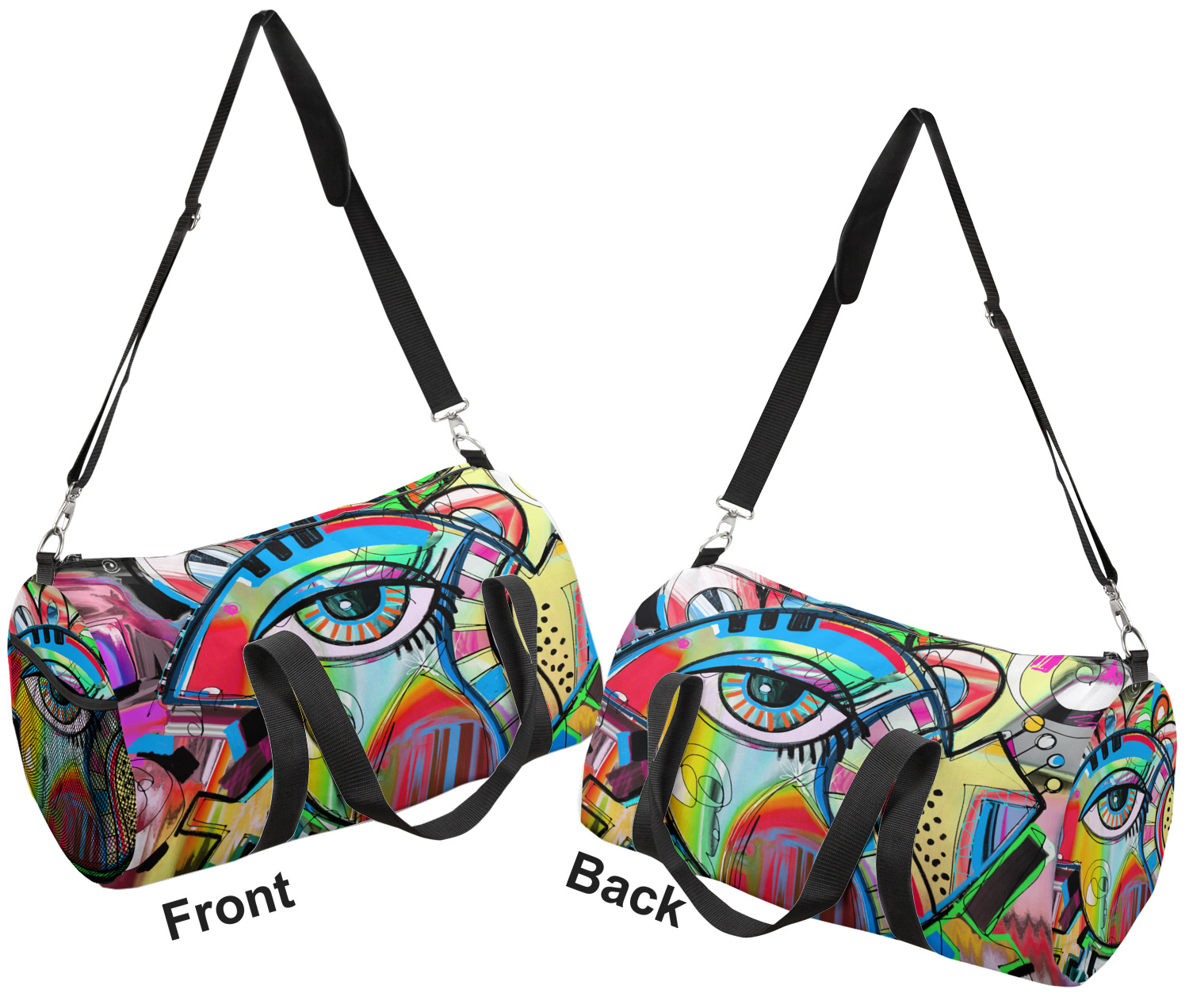 This duffle is a sturdy bag made of a canvas material. It comes in two sizes: Small (19"W x 9.5"H x 9.5"D) and Large (23"W x 12"H x 12"D). The bag is a cylindrical shape with a black adjustable strap and two handles. On one side is an elastic pouch to put a waterbottle or other small item. Your product will be sublimated with your design and is able to be designed on the front, back, and sides. Be sure to remember that the straps may cut into parts of your design if you upload your own artwork.