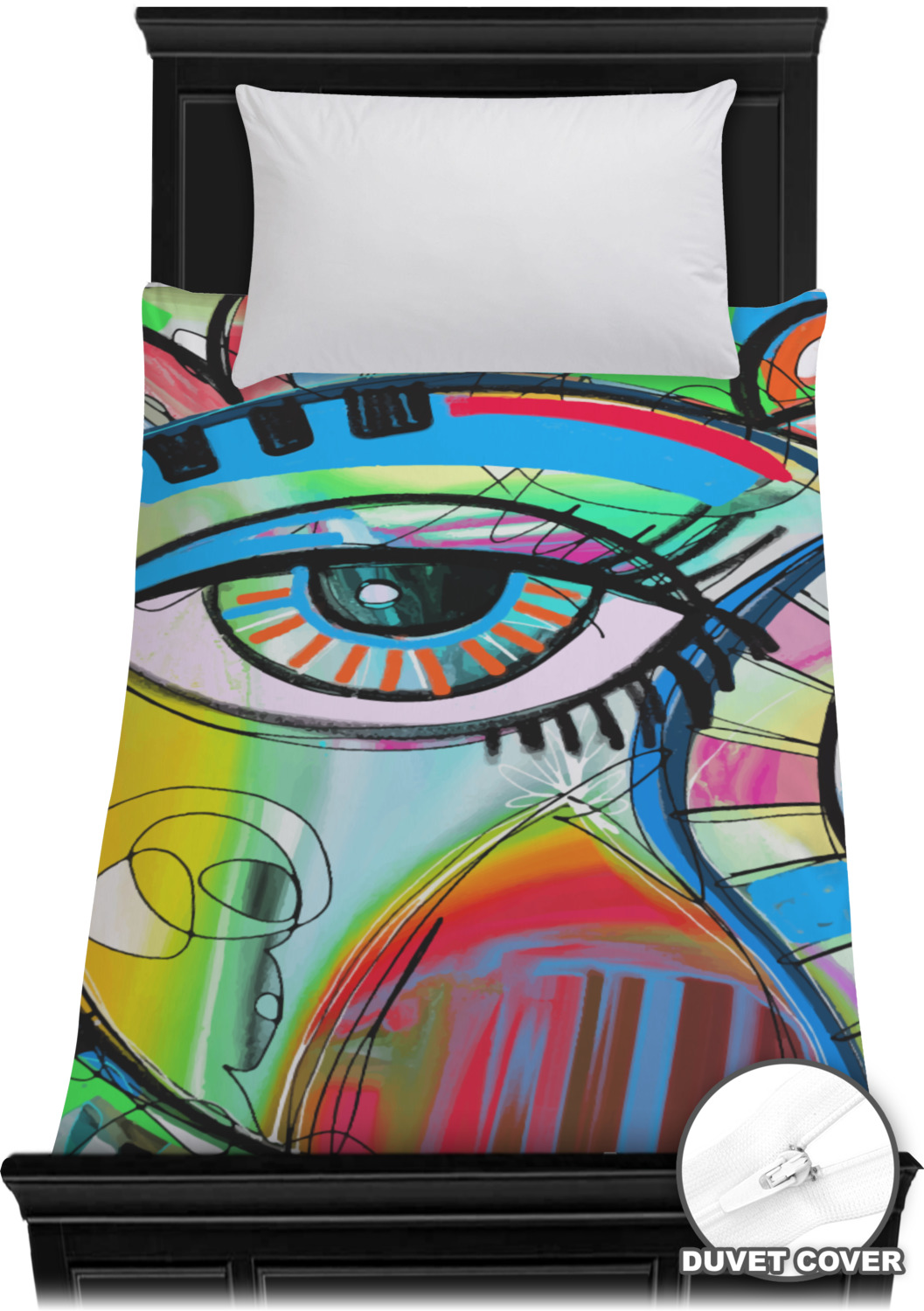 This design features a large abstracted eye in the center, surrounded by extremely vibrant, surrealistic shapes.
