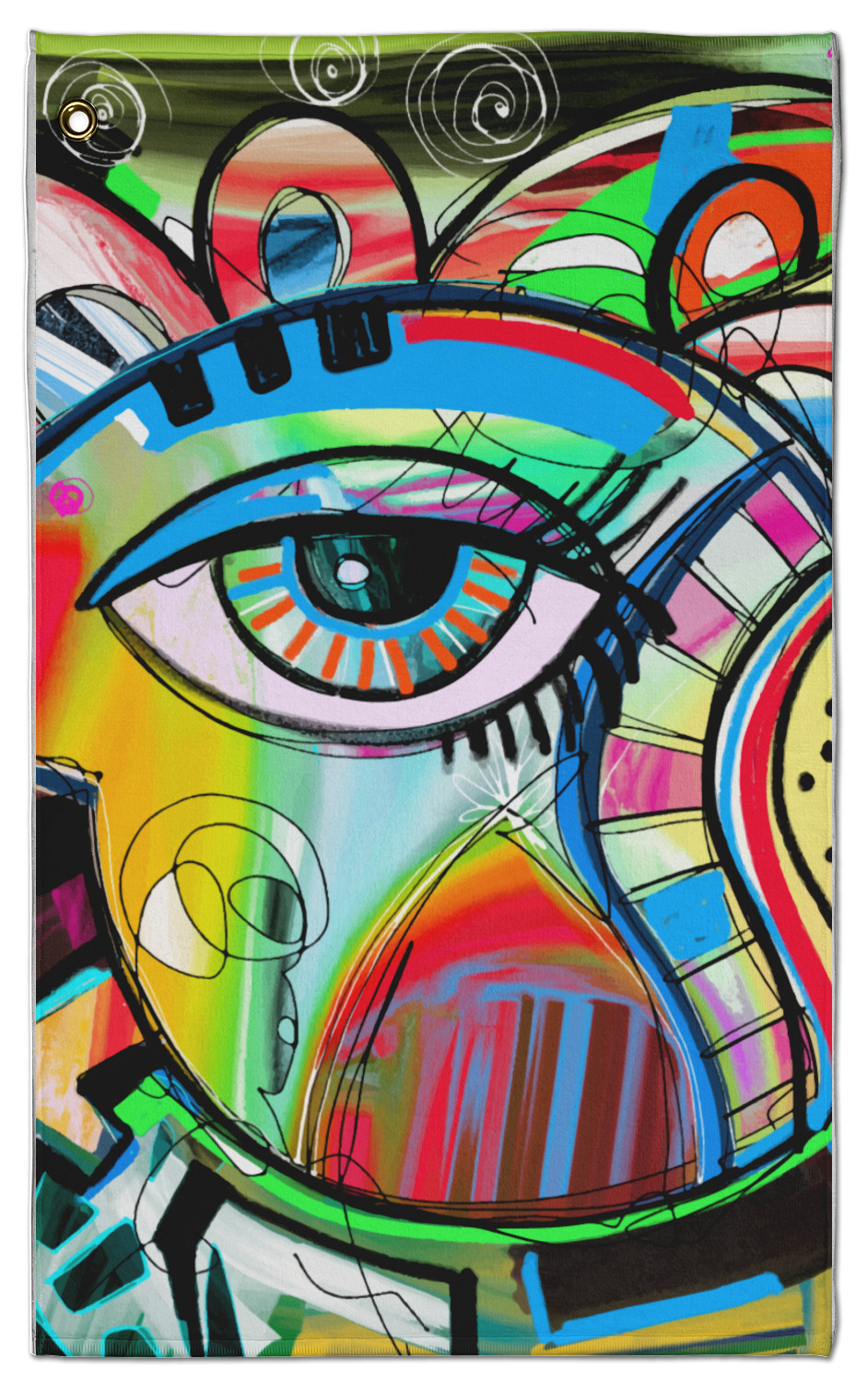 This design features a large abstracted eye in the center, surrounded by extremely vibrant, surrealistic shapes.
