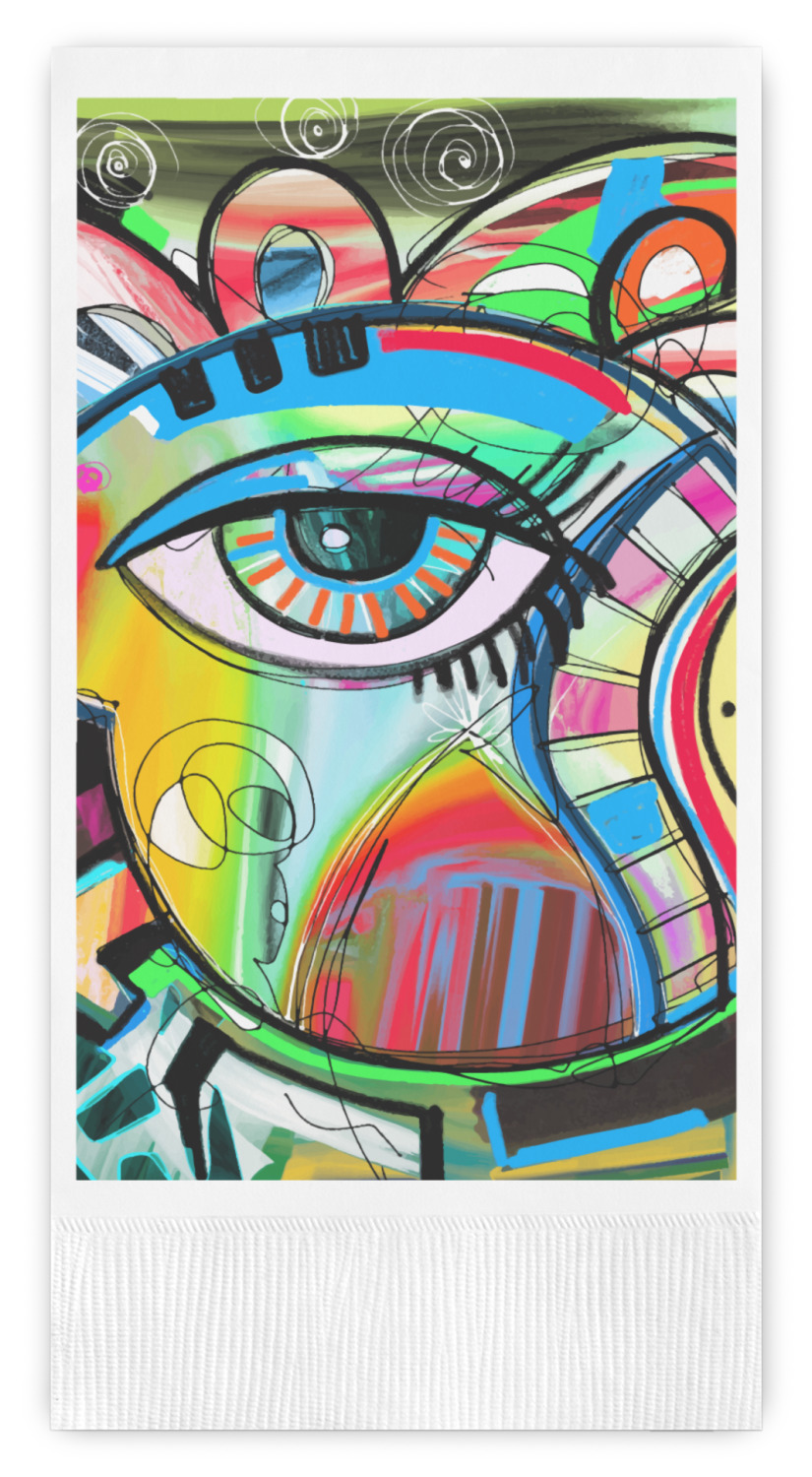 This design features a large abstracted eye in the center, surrounded by extremely vibrant, surrealistic shapes.