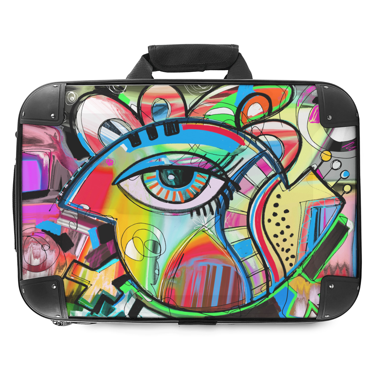 This design features a large abstracted eye in the center, surrounded by extremely vibrant, surrealistic shapes.