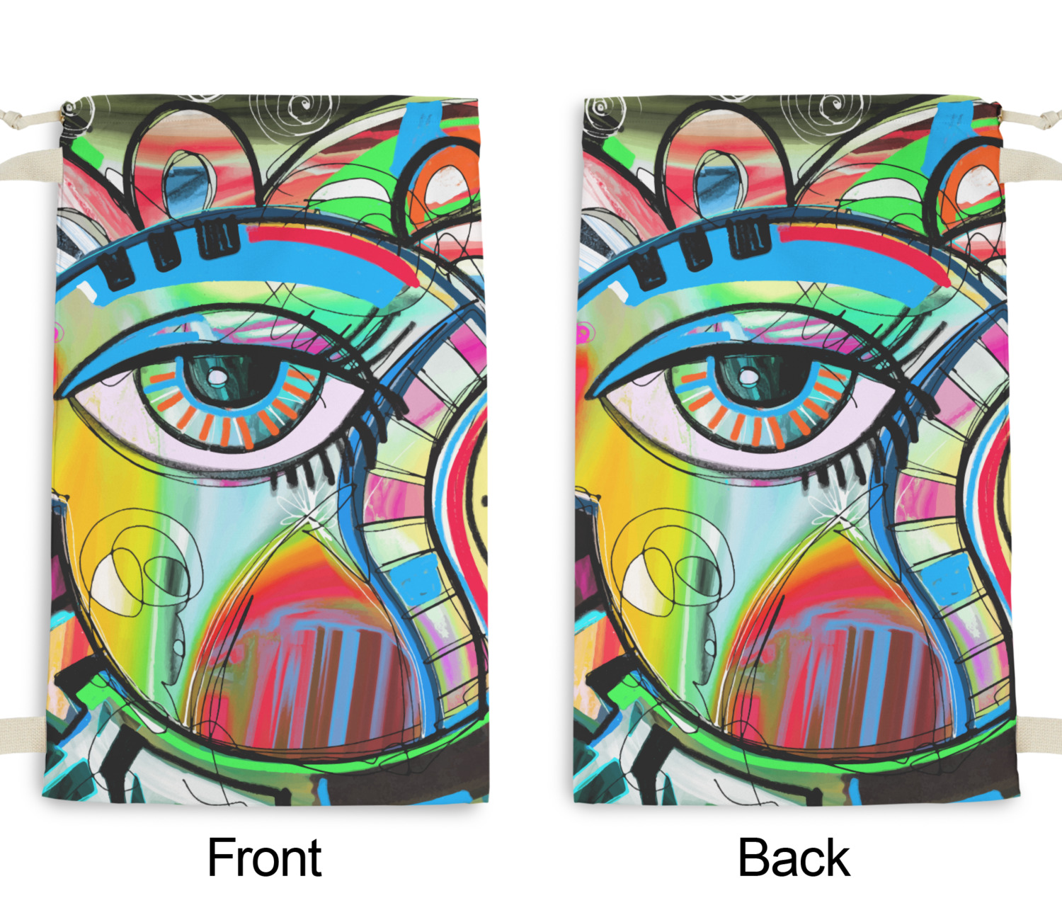 This design features a large abstracted eye in the center, surrounded by extremely vibrant, surrealistic shapes.