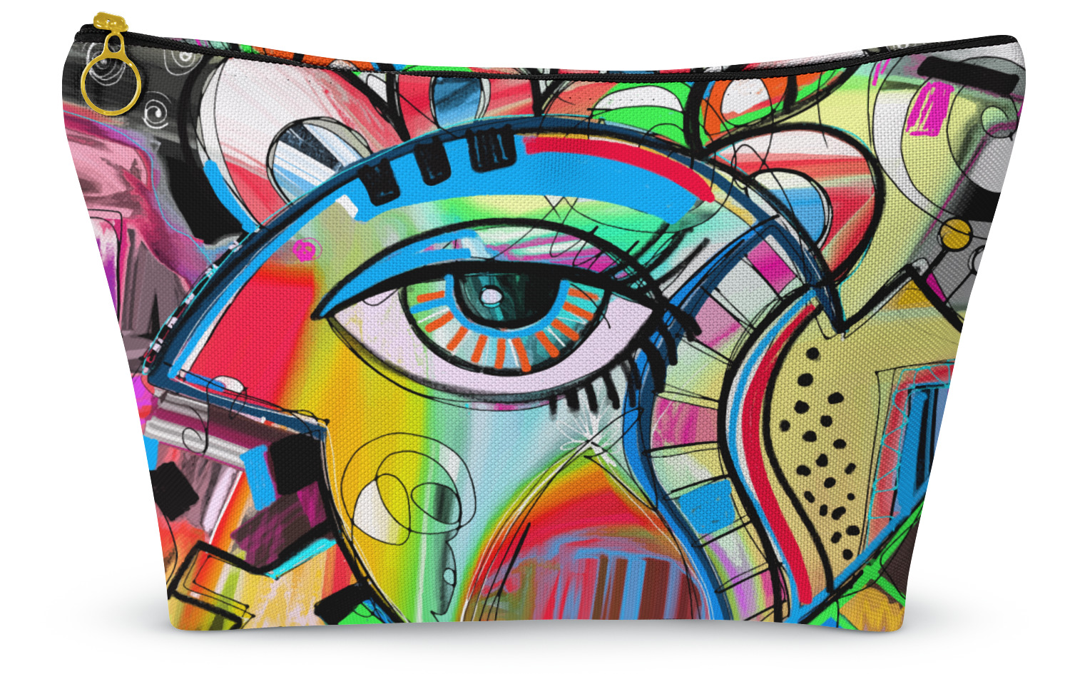 This design features a large abstracted eye in the center, surrounded by extremely vibrant, surrealistic shapes.