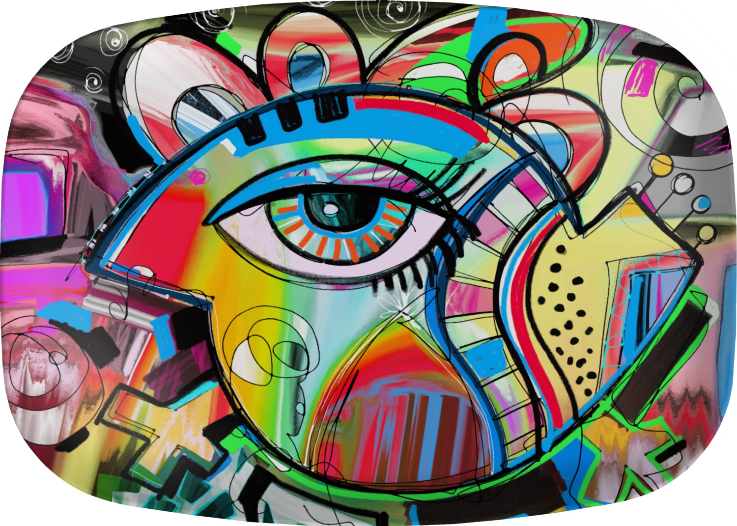 This design features a large abstracted eye in the center, surrounded by extremely vibrant, surrealistic shapes.