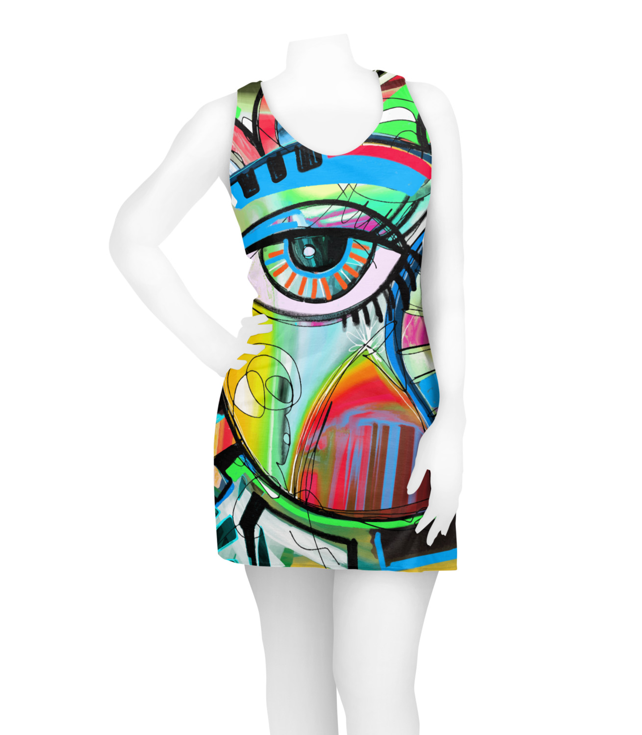 This design features a large abstracted eye in the center, surrounded by extremely vibrant, surrealistic shapes.
