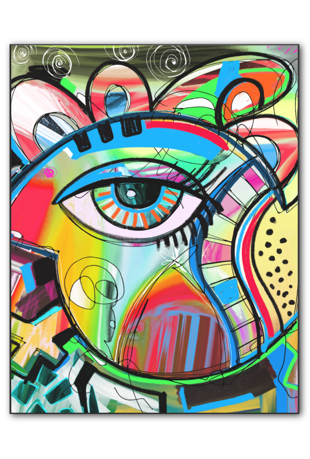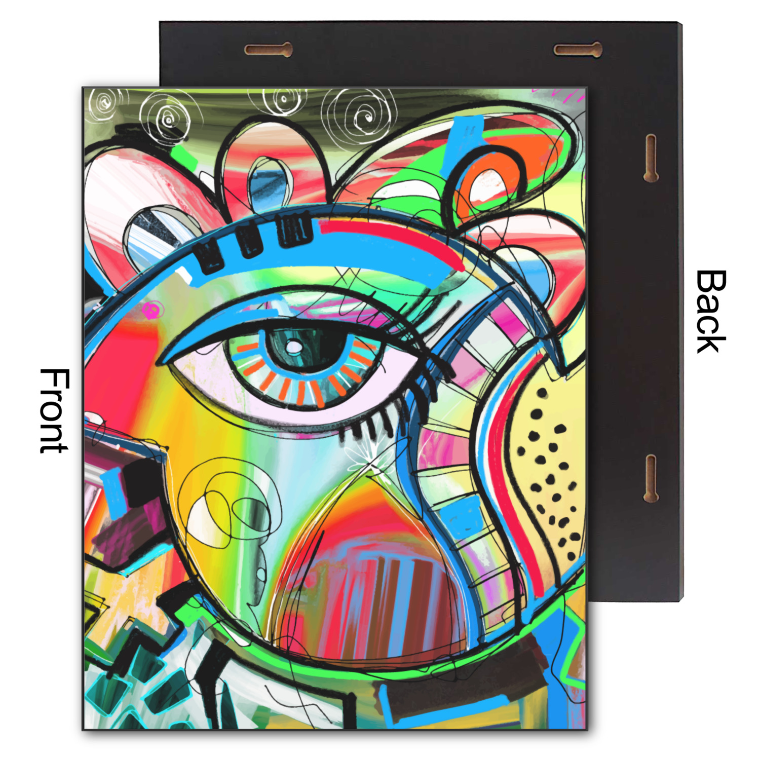 This design features a large abstracted eye in the center, surrounded by extremely vibrant, surrealistic shapes.
