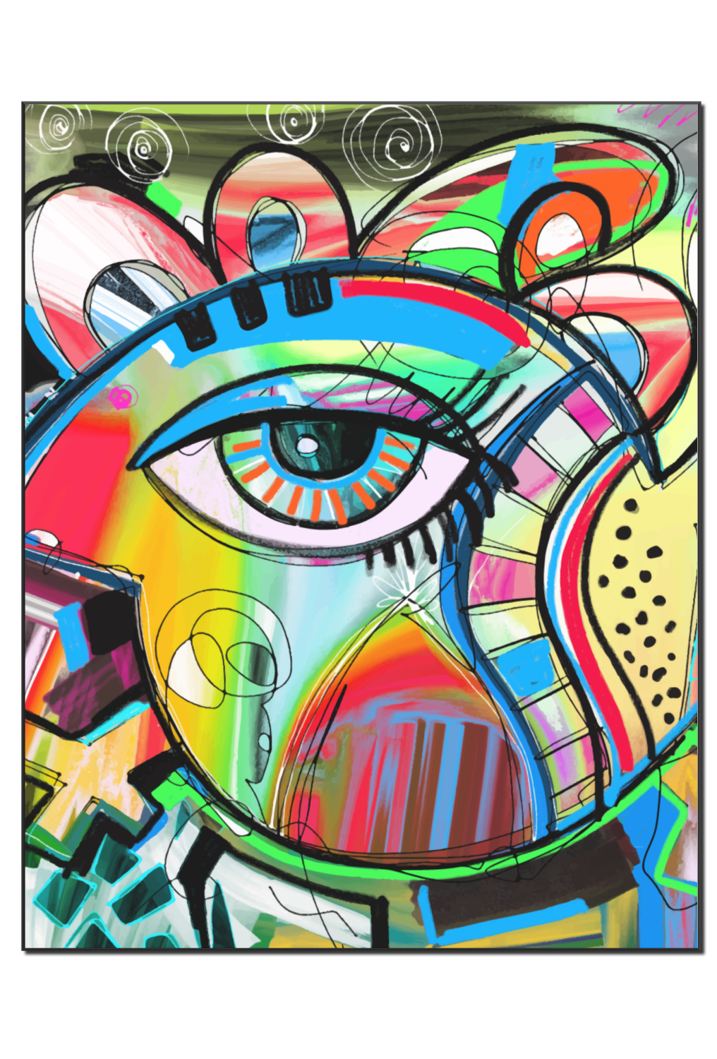 This design features a large abstracted eye in the center, surrounded by extremely vibrant, surrealistic shapes.