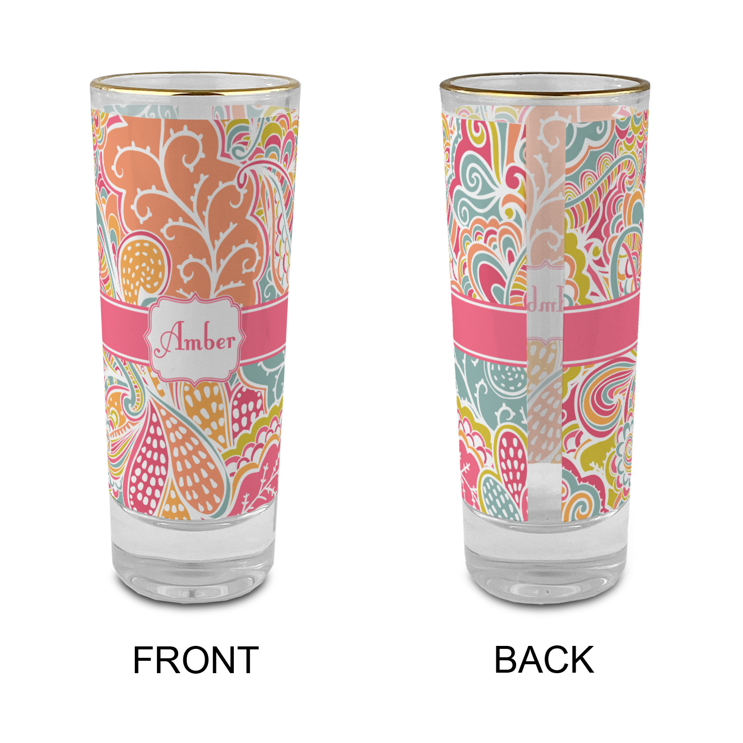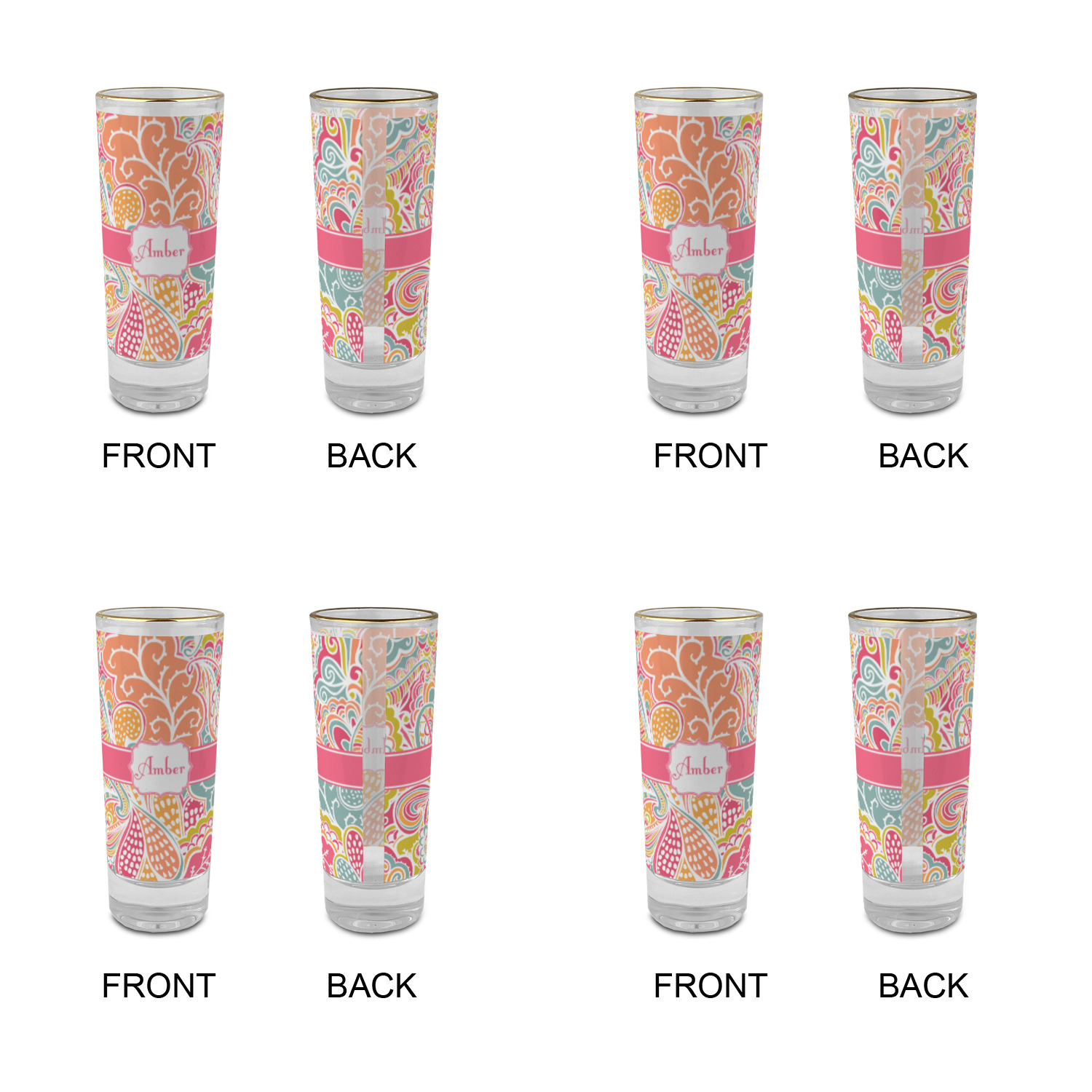 These glass shooter glasses are printed in full color with the design of your choice. These are a tall shooter 2 oz size and stand 4" tall. The print is a full wrap design to boldly display your personalization.