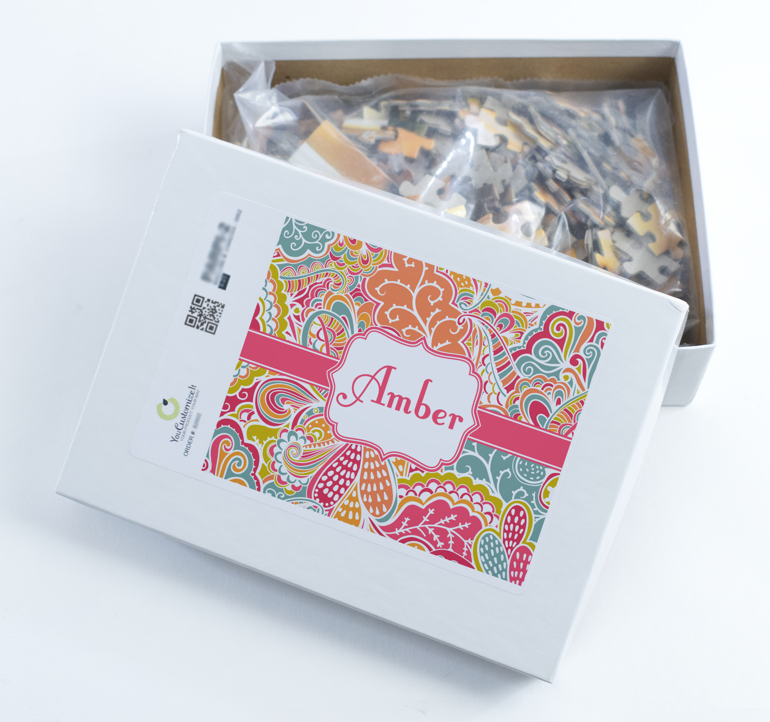 We print our puzzles on thick white chipboard in vibrant colors, then laminate the chipboard and die cut your puzzle. Your jigsaw puzzle is shipped to you in a box with the image of the puzzle on the box.