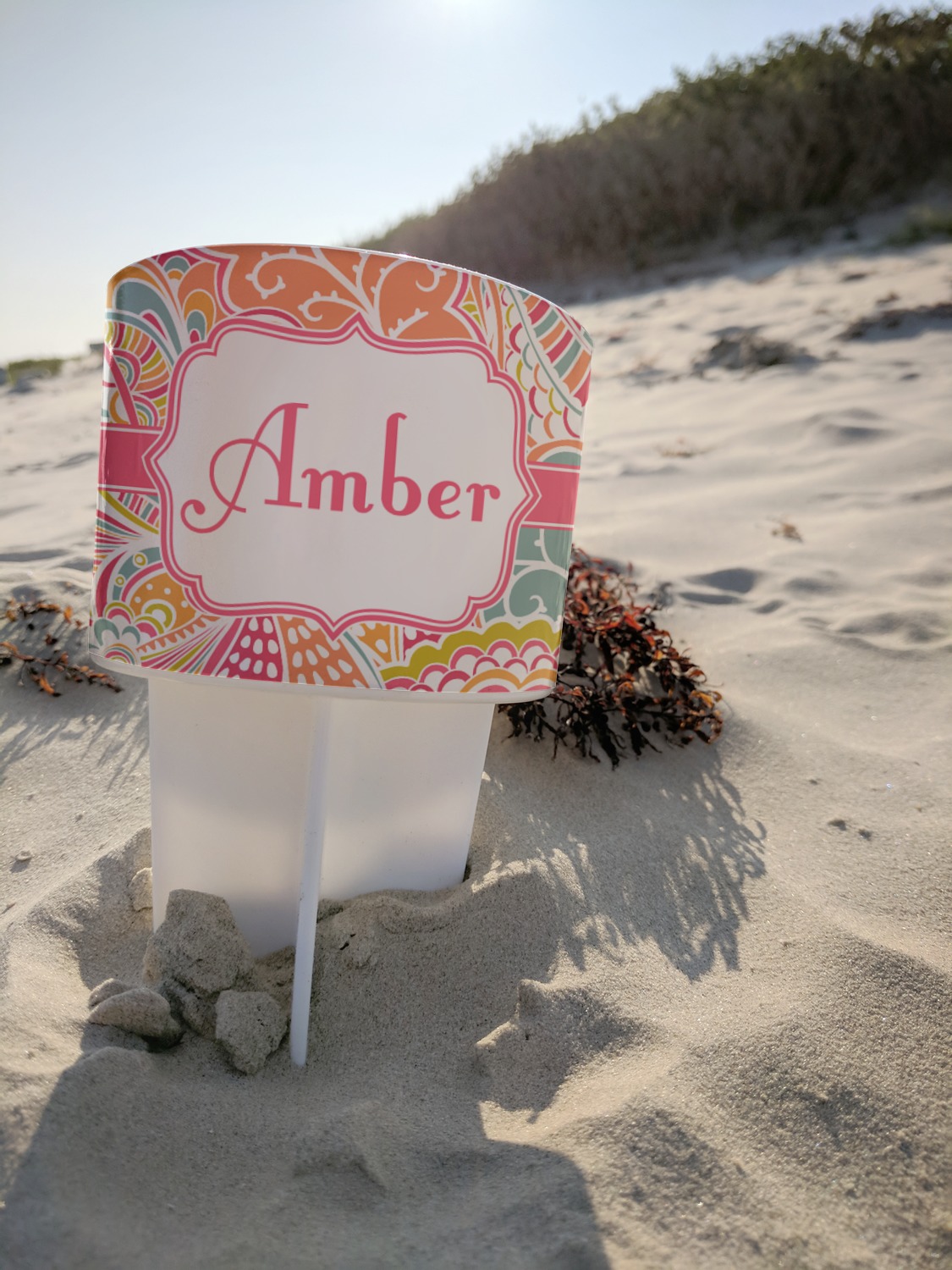 This cup holder has a large stake at its bottom that anchors it to the sand or ground below, while the cup holder rests above the stake. The entire drink holder is made of durable plastic and displays your customization around the cup holder portion. We sell these personalized beach spikers in two different colors: black and white.