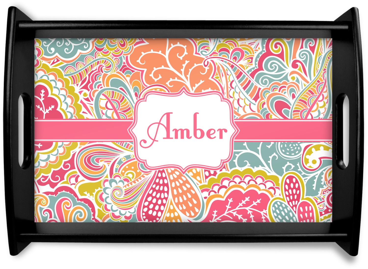 This serving tray with handles features square edges and two rounded sides, creating a very modern look. Each side is fabricated from a beautifully cut, natural wood. The bottom of the interior of the tray displays your customized design in bright, vibrant color. The tray is sold in both a black color and a natural wood look. Each variation of the wood serving tray has two sizes: Small, which is 14" x 10" x 2.25", and Large, which is 19.5" x 13.5" x 2.75".