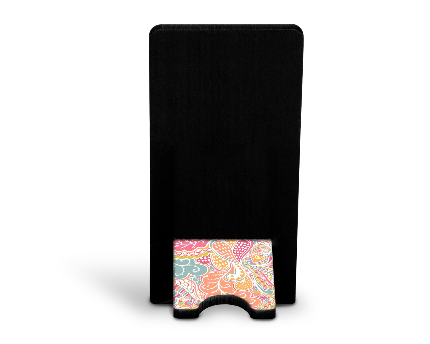 These cell phone holders are comprised of two hardboard pieces, that lock into and steady one another. The bottom part of the mobile phone stand is spacious enough to support both your phone and your charger, while it is not in use. We print your customization atop the face of this stand, while the remaining sides are a sophisticated, black color.