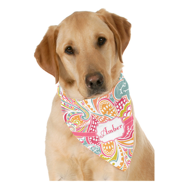 This beautiful pet bandana really is the perfect accessory. It is made from a silky feeling polyester and measures at approximately 23" x 23". Your personalization will be printed on a diagonal, so that you are able to read the personalization when folded into a triangle. This bandana fits best on large dogs, but can be folded smaller if there is no personalized text to fit smaller pets.