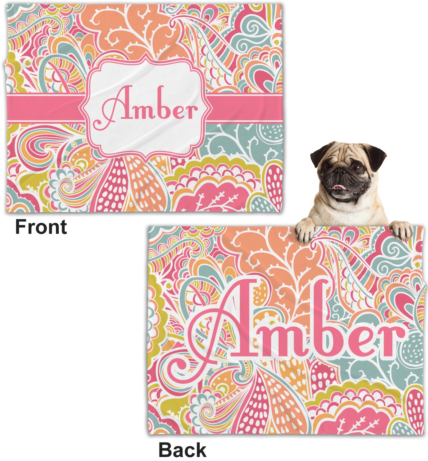 These dog blankets are crafted from a gentle, soft-to-the-touch, minky material. We print your customizations, either matching or differing, on both the top and underside of the blanket. These personalized dog blankets are available in two sizes: regular and large. Our regular size, at 40" x 30", accommodates small and some medium size dogs. At 60" x 50", our large dog blanket is a better fit for bigger breeds. Though specialized for dogs, these blankets still make a thoughtful gift for your favorite feline, or any other pet in mind!