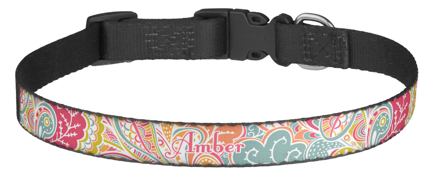 This sturdy collar, made from a durable nylon weave, will outlive your dog's episodes of excited tugging and pulling. Courtesy of its thick plastic buckle and adjuster, this collar is adjustable and accommodating of any dog. Structurally, the collar is a single piece of nylon weave that is sewn together, and features a solid metal loop where you can attach a leash or dog tag. We print and display your dog's name and pattern across the middle of the personalized dog collar.