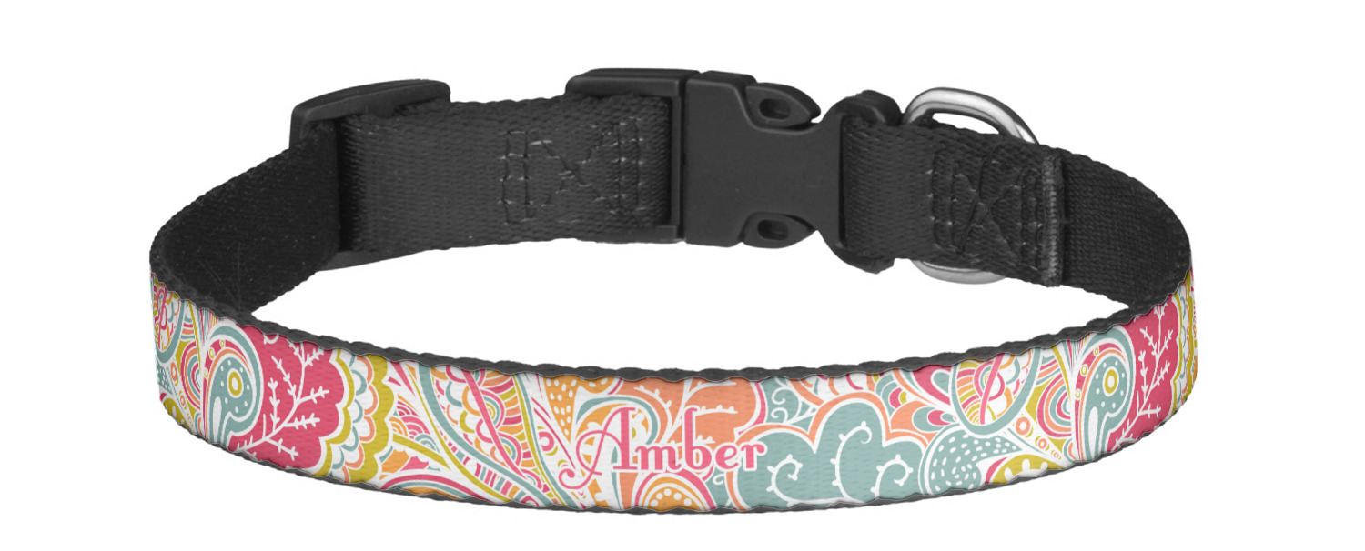 This sturdy collar, made from a durable nylon weave, will outlive your dog's episodes of excited tugging and pulling. Courtesy of its thick plastic buckle and adjuster, this collar is adjustable and accommodating of any dog. Structurally, the collar is a single piece of nylon weave that is sewn together, and features a solid metal loop where you can attach a leash or dog tag. We print and display your dog's name and pattern across the middle of the personalized dog collar.