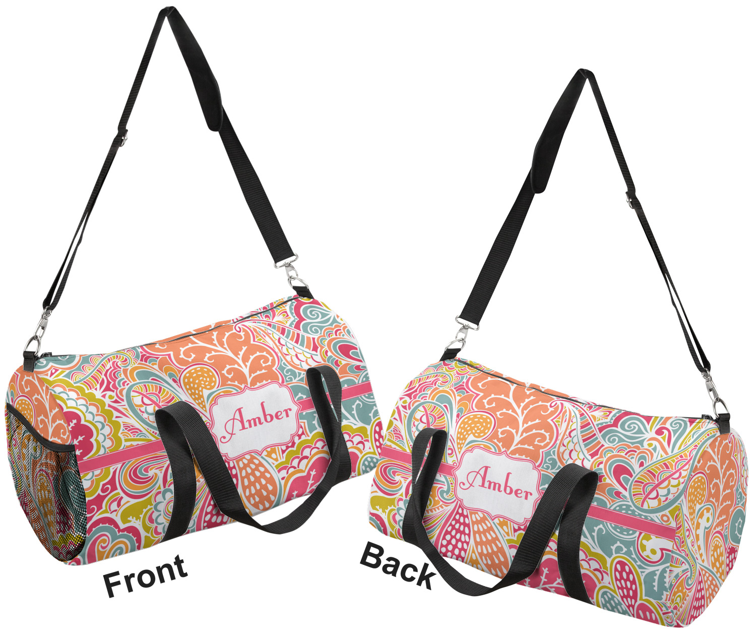 This duffle is a sturdy bag made of a canvas material. It comes in two sizes: Small (19"W x 9.5"H x 9.5"D) and Large (23"W x 12"H x 12"D). The bag is a cylindrical shape with a black adjustable strap and two handles. On one side is an elastic pouch to put a waterbottle or other small item. Your product will be sublimated with your design and is able to be designed on the front, back, and sides. Be sure to remember that the straps may cut into parts of your design if you upload your own artwork.