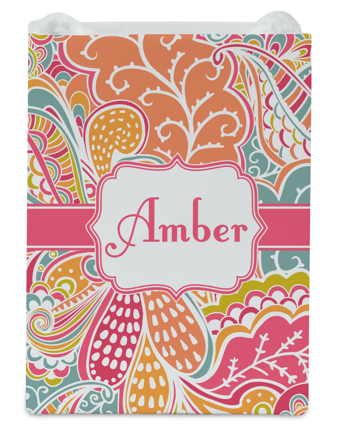 A pink ribbon with white stitching attached to a decorative white label trimmed in pink ties the entire design together. Add personalization of your choice in a coordinating color to make this pattern even more special.