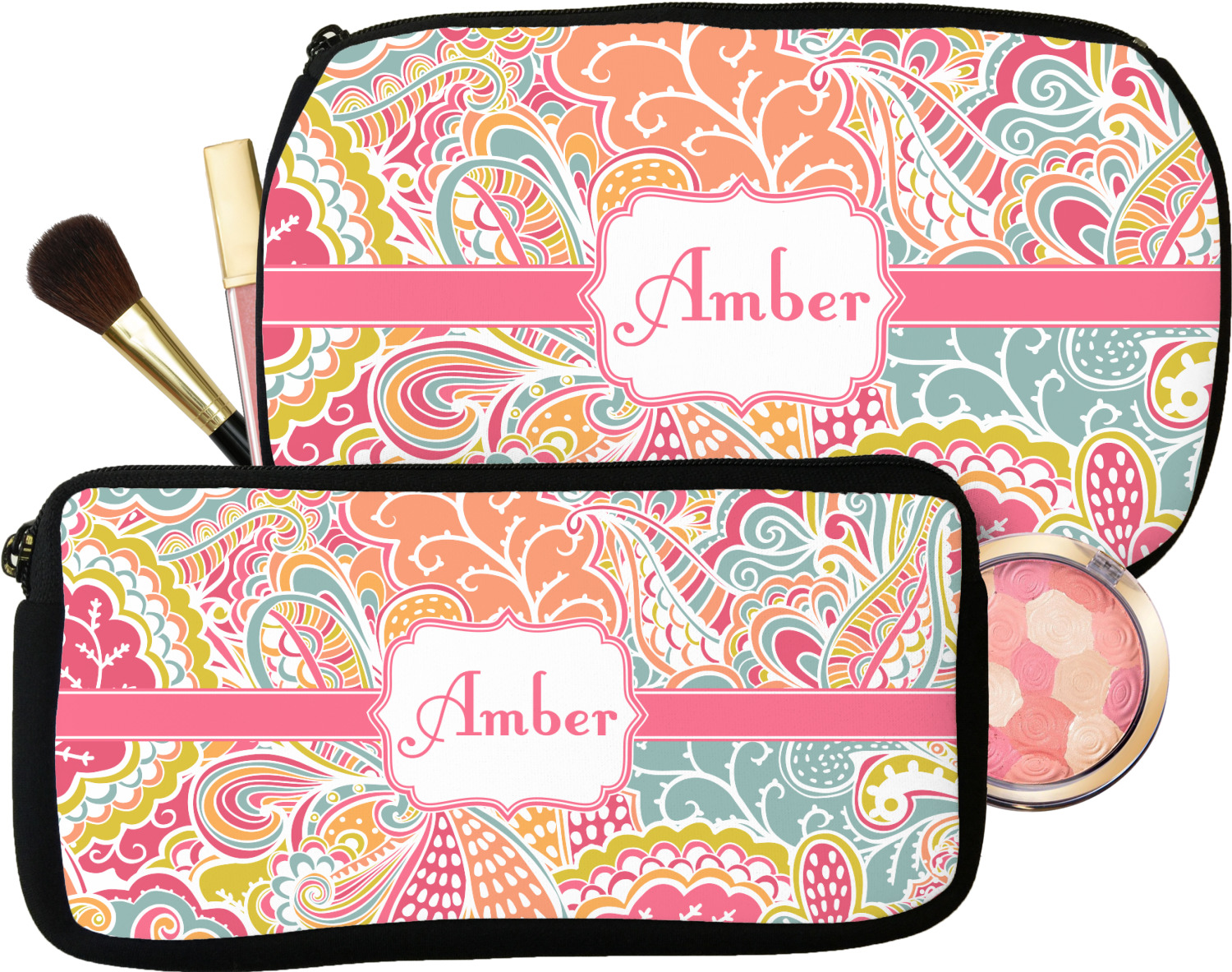 Our personalized makeup bags are available in many different designs, patterns and colors - so you are sure to find one that will love. They are made of neoprene (same material as wet-suits) and thus are water resistant, so spillages in your makeup bag will not end up all over you purse. They are customized on one side and are black on the other side and the zipper is black as well.
