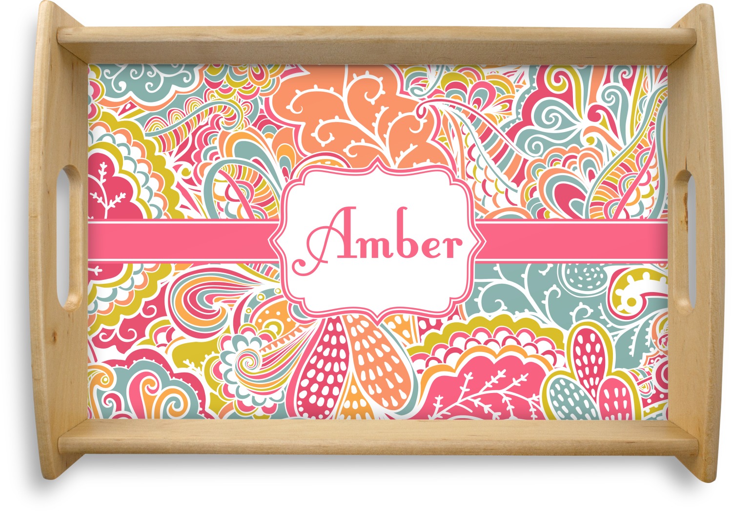 This serving tray with handles features square edges and two rounded sides, creating a very modern look. Each side is fabricated from a beautifully cut, natural wood. The bottom of the interior of the tray displays your customized design in bright, vibrant color. The tray is sold in both a black color and a natural wood look. Each variation of the wood serving tray has two sizes: Small, which is 14" x 10" x 2.25", and Large, which is 19.5" x 13.5" x 2.75".