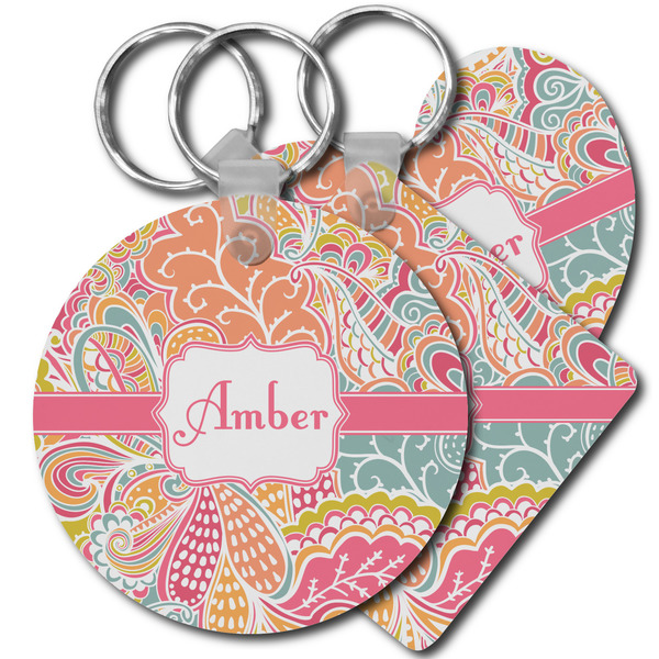Our personalized keychains attach to the included metal, split key ring with a plastic, removable snap. Since a metal ring is included with your purchase, you have the liberty to keep your keys together on the ring, with or without your unique keychain. We offer this keychain in three different shapes: circle, heart, or diamond. We print your personalized design(s) on both sides of the key chain, and the surface has a glossy, reflective finish that only emphasizes your design. Each keychain is approximately 2.25 by 2.25 inches.